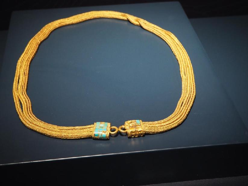 這是11月24日拍攝的出土於(yu) 2018血渭一號墓的鑲綠鬆石金鏈。新華社記者 白瑪央措 攝