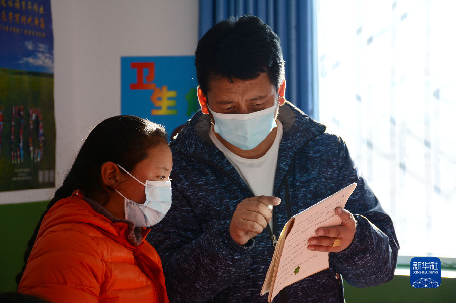在青海省果洛藏族自治州瑪多縣地震災後過渡安置一校區五年級二班,教師者才(右)在課堂上為(wei) 學生輔導作業(ye) (12月18日攝)。
