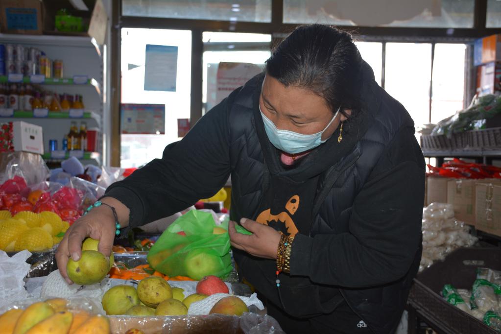 在青海省果洛藏族自治州瑪多縣的菜鋪內(nei) ,當地居民渠東(dong) 正在挑選水果。柳澤興(xing) 攝