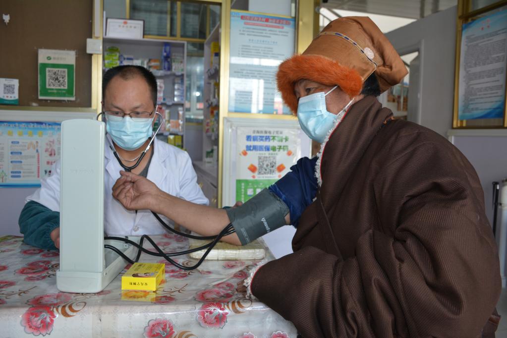 在青海省果洛藏族自治州瑪多縣的複康診所內(nei) ,醫生正在給當地居民日洛量血壓。柳澤興(xing) 攝