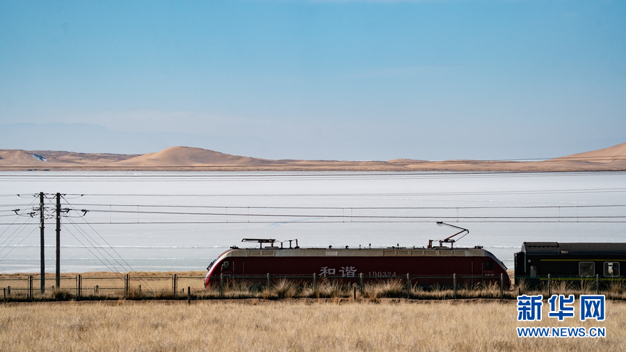 列車從(cong) 青海湖畔緩緩駛過。新華網 宋忠勇 攝