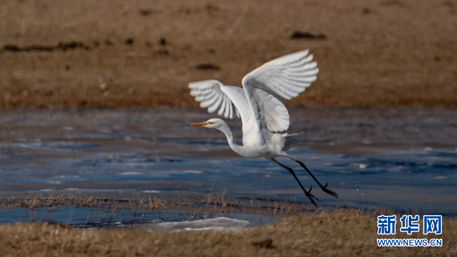一隻白鷺在青海湖畔飛舞。新華網 宋忠勇 攝
