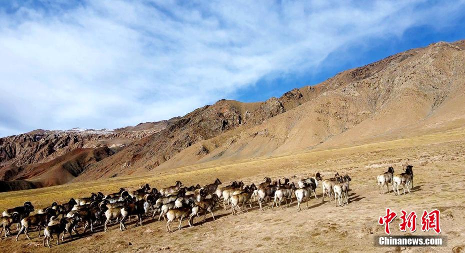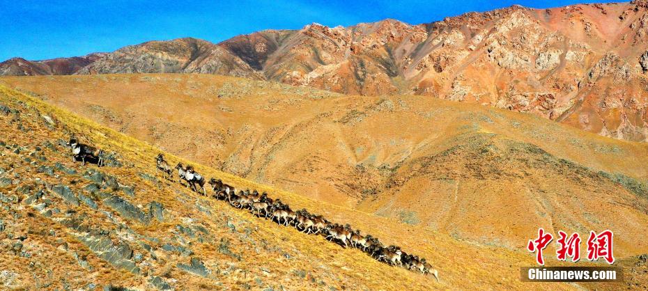 近日,攝影愛好者在地處柴達木盆地的青海省海西州都蘭(lan) 縣香加鄉(xiang) 山區拍到成群盤羊。