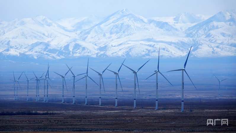 雪山下的風力發電機組(央廣網記者 張海東(dong) 攝)