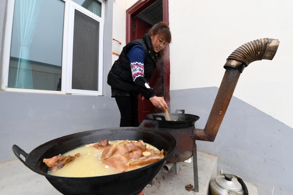 1月25日,在蘭(lan) 州新區舟曲避險搬遷安置點家中小院,寧蘭(lan) 玉炸油饃、煮臘肉。新華社記者 範培珅 攝
