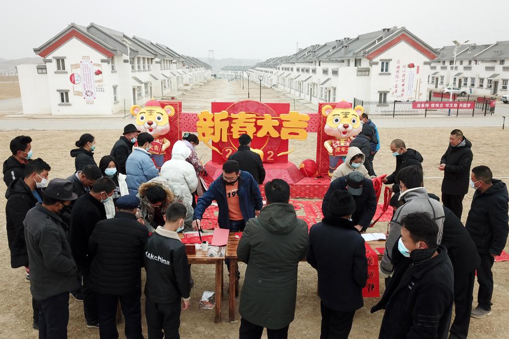 1月25日,在蘭(lan) 州新區舟曲避險搬遷安置點,舟曲地質災害避險搬遷第一臨(lin) 時黨(dang) 支部組織書(shu) 法家給搬遷群眾(zhong) 送春聯。新華社記者 範培珅 攝