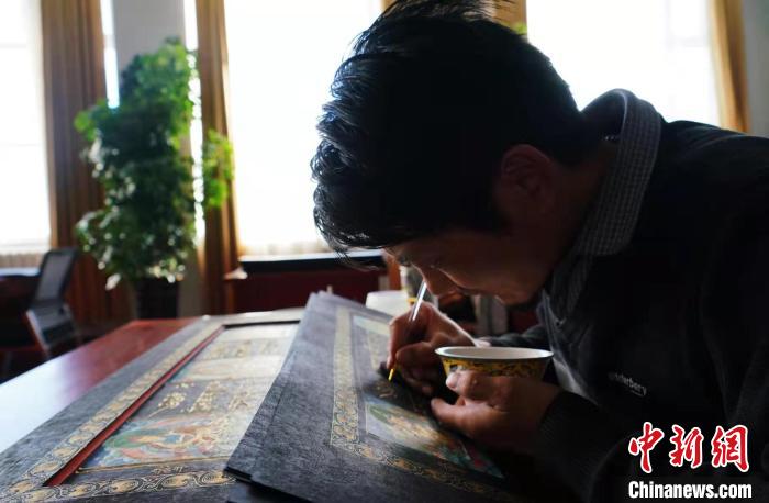 走進非物質文化遺產(chan) 綜合傳(chuan) 習(xi) 中心(熱貢文化)內(nei) ,幾十名學員端坐在桌前,持竹筆蘸著金汁或銀汁在特質的藏紙上抄寫(xie) 經文,另一側(ce) ,幾名學員盤腿而坐,在寫(xie) 好的金書(shu) 上開始繪製唐卡。