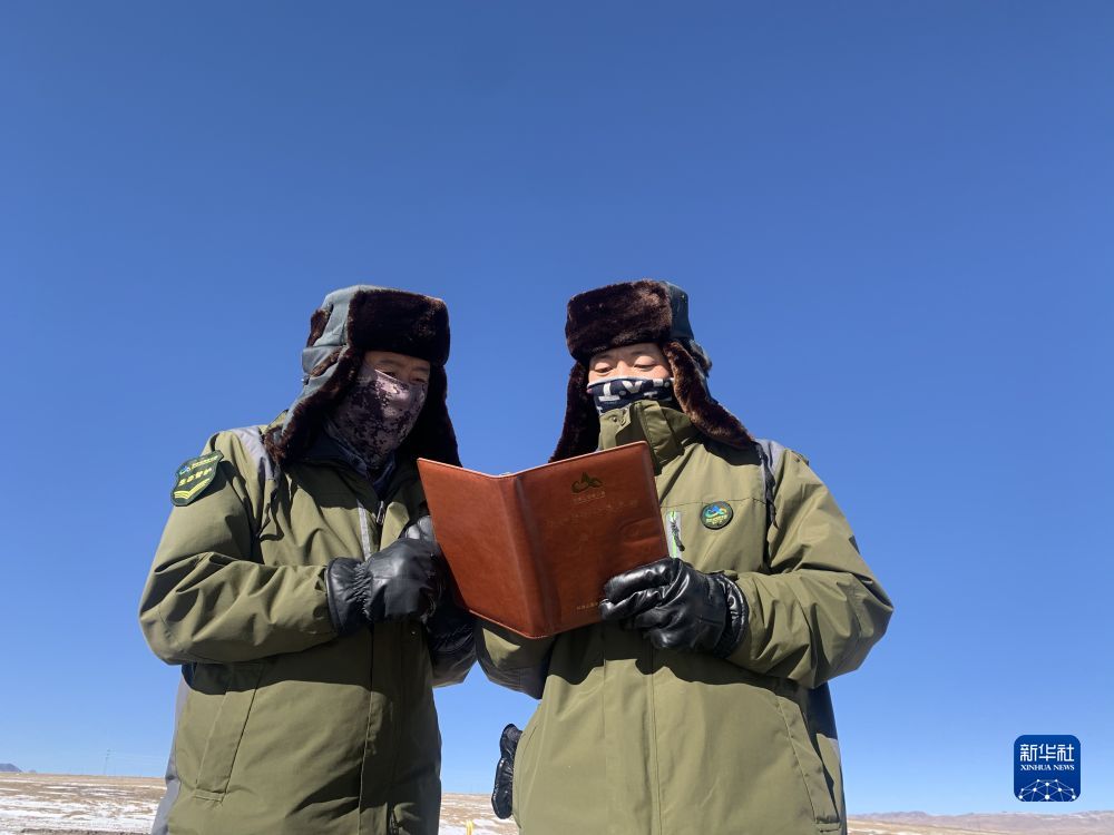 2021年12月3日,祁連山國家公園沙龍灘管護站巡護隊隊長楊有財(左)在巡護監測記錄手冊(ce) 上記錄。新華社 李琳海 攝