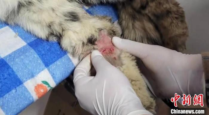 圖為(wei) 雪豹右後腿受傷(shang) 。都蘭(lan) 縣融媒體(ti) 中心 供圖