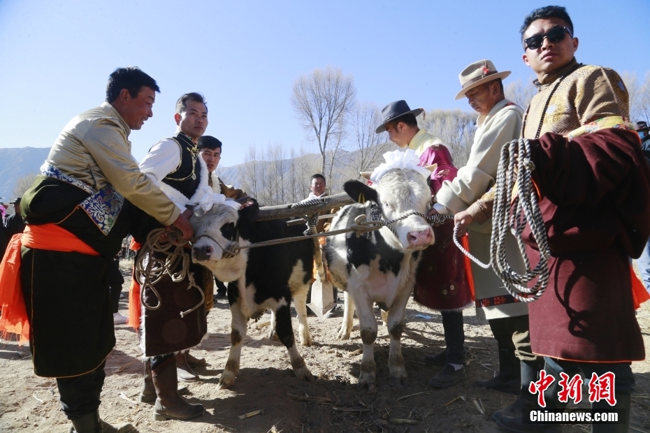 2月24日,藏族民眾(zhong) 用“二牛抬杠”的傳(chuan) 統方式開啟新春第一犁。中新社記者 馬銘言 攝