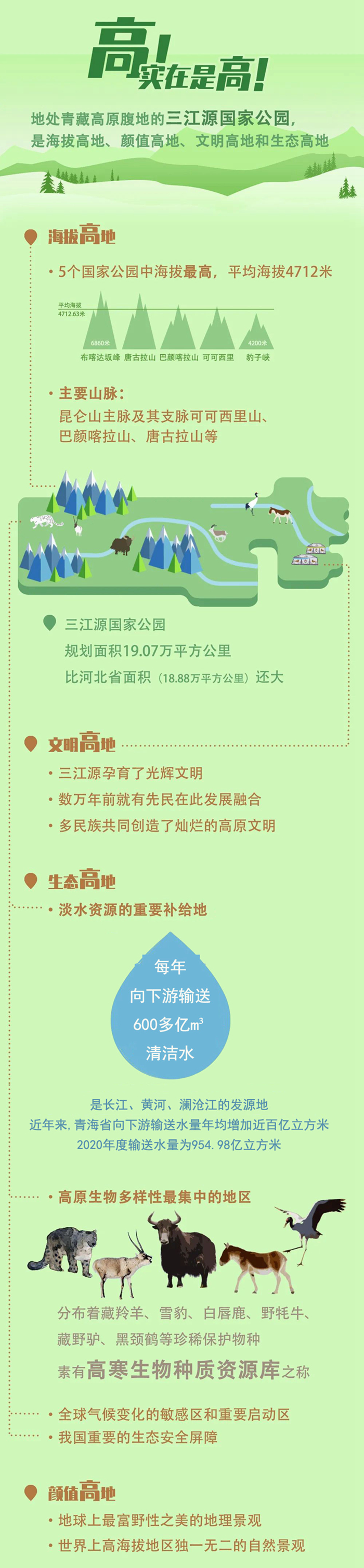 2021年10月12日宣布正式設立的三江源國家公園,將黃河、長江源頭及野生動物重要棲息地完整納入,使自然生態係統得到係統性、原真性、完整性保護。
