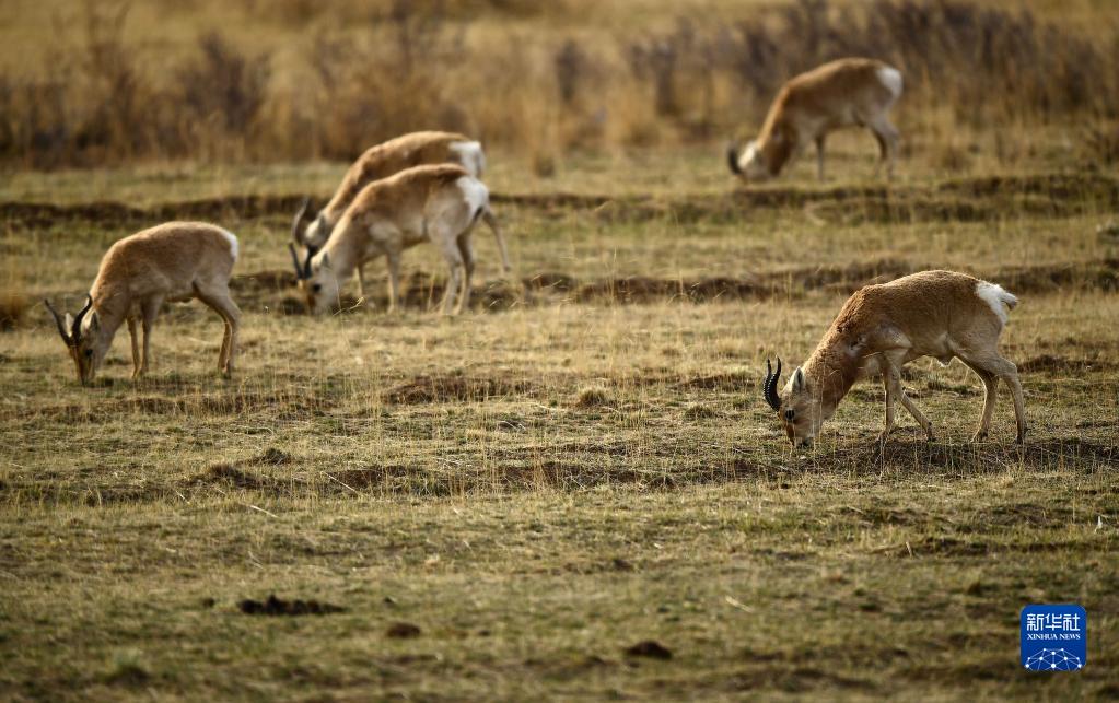 2018年4月26日,一群普氏原羚在青海省海北藏族自治州剛察縣哈爾蓋鎮附近的草原覓食。新華社記者 張宏祥 攝