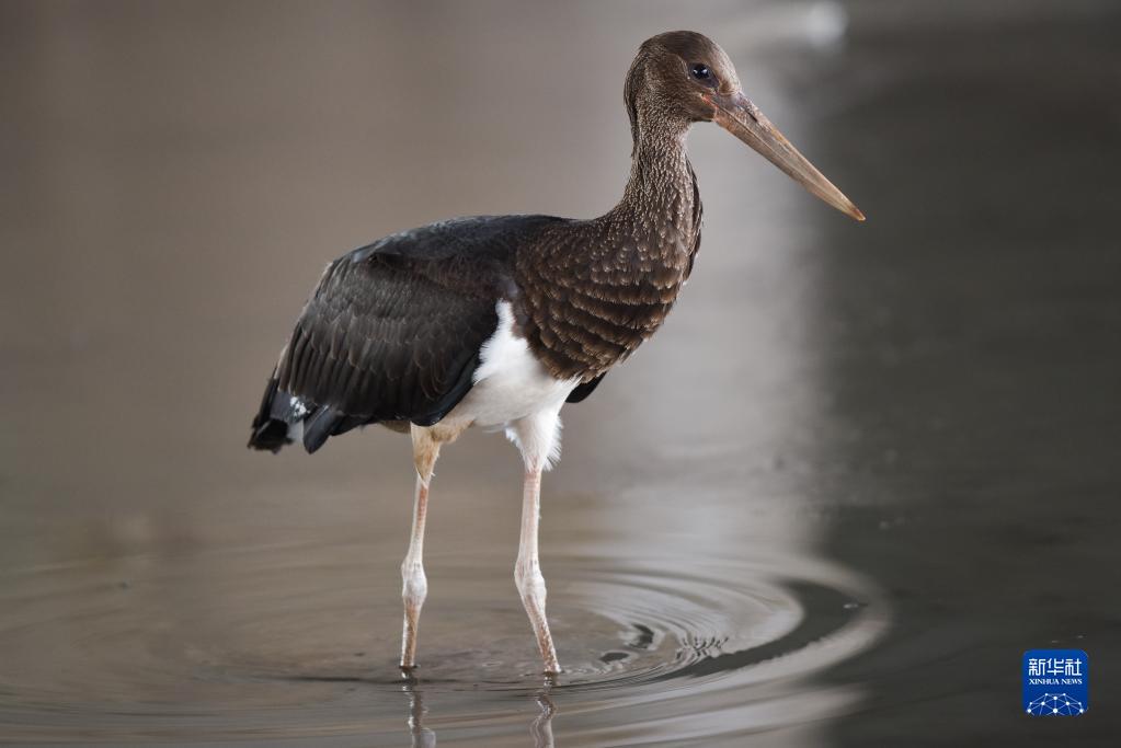 2020年12月6日,一隻黑鸛在西寧市北川河濕地公園內(nei) 覓食。新華社記者 吳剛 攝