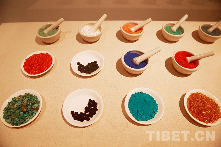 唐卡在顏料原料的選擇上,以礦物和植物為(wei) 主,比如:金、銀、瑪瑙、孔雀石、青金石、朱砂等,以及藏紅花、大黃、藍靛等。天然的原料加之獨特的研製工藝,所繪製出的唐卡曆經數百年,依然可以保持色澤豔麗(li) 。圖為(wei) 唐卡顏料的原料 攝影:許娜