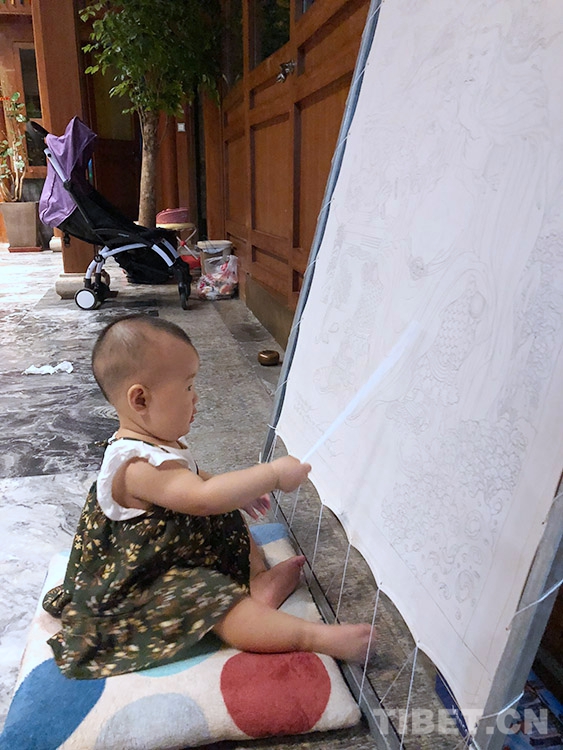 仁青多傑自己也有兩(liang) 個(ge) 女兒(er) ,大女兒(er) 已經快五歲了,受家庭環境熏陶,從(cong) 會(hui) 走路時起,就喜歡拿毛筆,也非常喜歡畫畫。仁青多傑和父親(qin) 每天都在畫畫,有一次在北京,仁青多傑的一幅唐卡快要完成了,女兒(er) 趁著中午大人們(men) 吃飯的間歇,跑出去拿著毛筆和顏料自己畫。那幅畫仁青多傑一直保留在北京,準備等女兒(er) 長大後送給她。