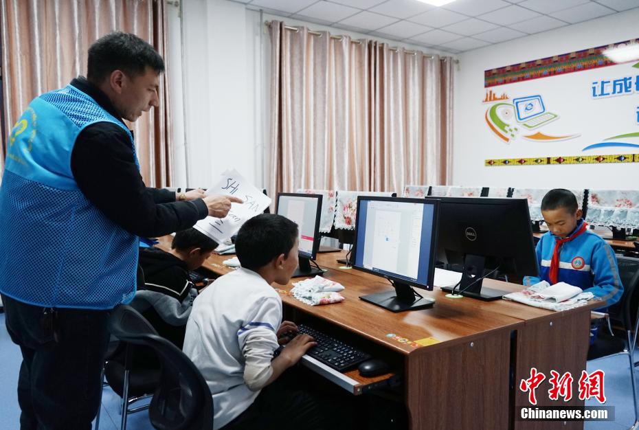 圖為(wei) 誌願者輔導孩子們(men) 學習(xi) 電腦打字。馬銘言 攝