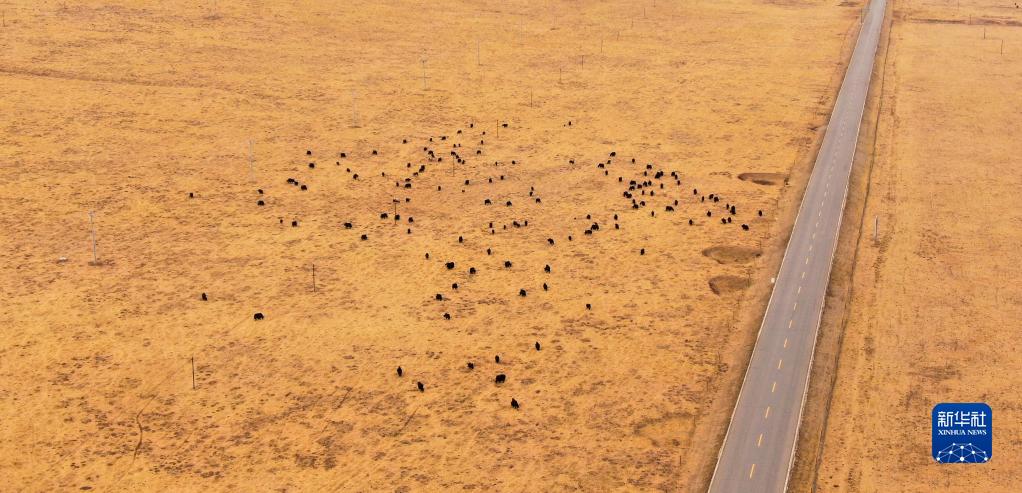 3月31日,在青海省黃南藏族自治州河南蒙古族自治縣,一群犛牛在草原上吃草(無人機照片)。新華社記者 王豔 攝
