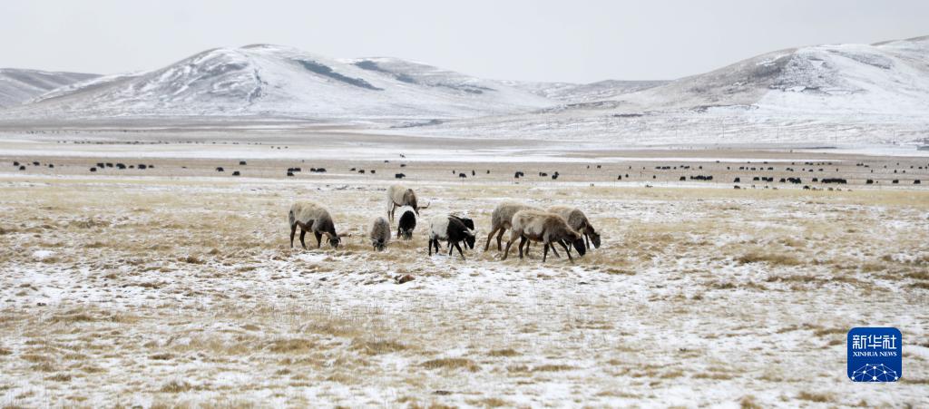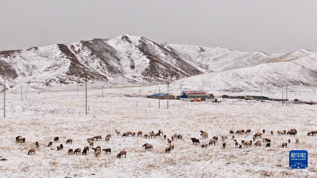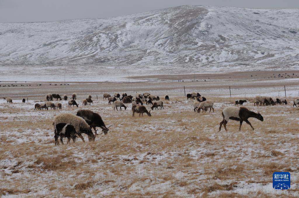 3月31日,青海省黃南藏族自治州河南蒙古族自治縣,一群歐拉羊在雪後的草原上吃草。 新華社記者 王豔 攝