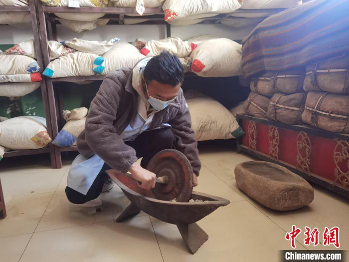 圖為(wei) 丁增紮西碾製藏藥。 潘雨潔 攝