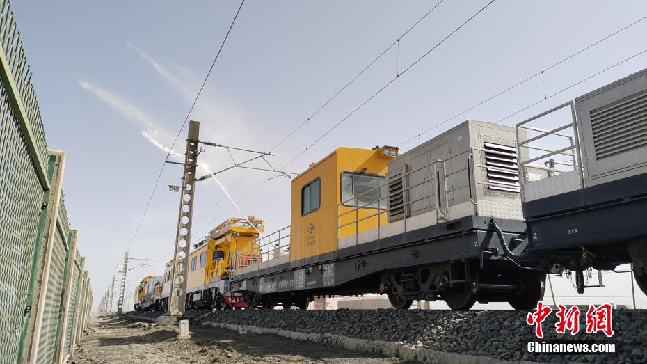 察爾汗鹽湖區域空氣中鹽分含量高,在這片區域,春秋季大風不僅(jin) 揚沙還會(hui) 揚鹽,很容易在鐵路牽引供電接觸網設備上形成鹽汙,造成線路跳閘,遇到雨雪天氣就會(hui) 放電,造成大麵積跳閘,誘發行車安全事故。圖為(wei) 接觸網工操作水炮進行清洗作業(ye) 。 王文誠 攝