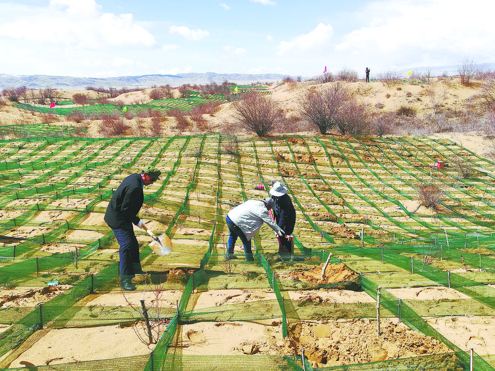 陶銳說:“比如在流動半流動沙丘,我們(men) 將工程固沙與(yu) 生物治沙相結合。在迎風麵設置1.5m×1.5m的草方格沙障,在設置好的草方格沙障內(nei) 栽植青楊,進行烏(wu) 柳插杆並點播檸條沙蒿等,而在背風坡實行插杆造林。在丘間地,我們(men) 則采取植苗造林,栽植烏(wu) 柳苗和沙棘苗,並用網圍欄進行封育等。”