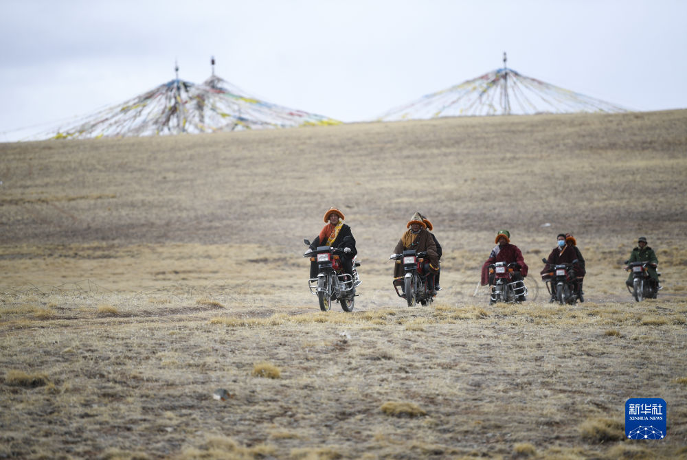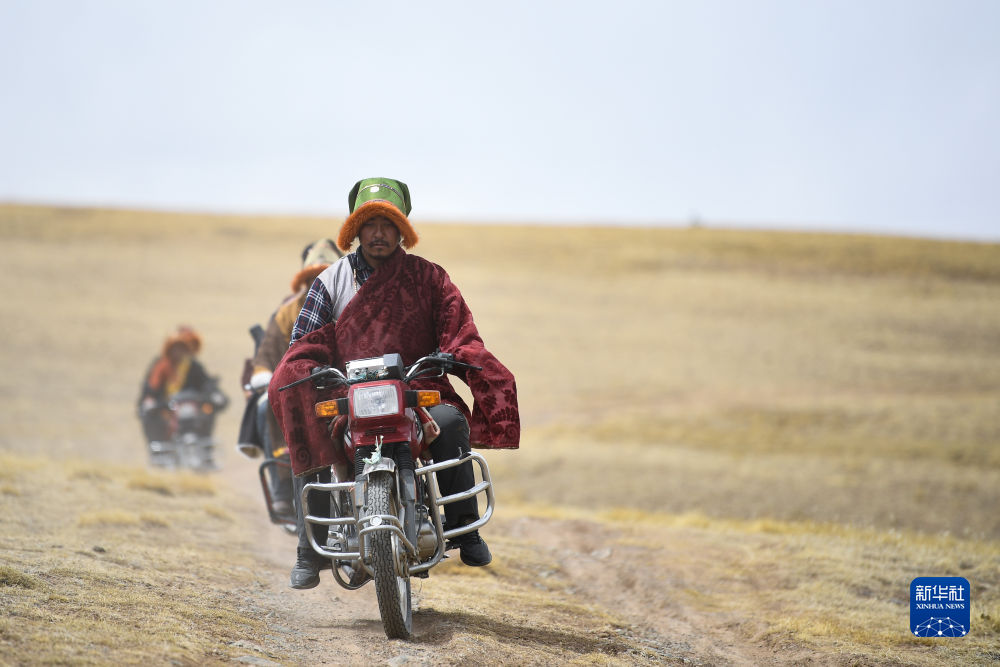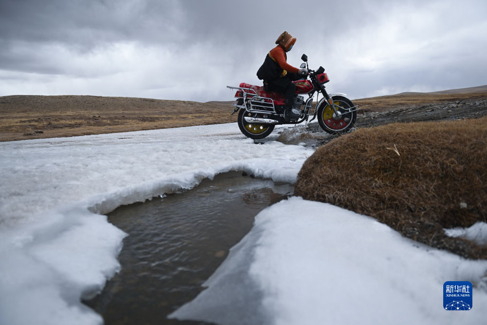 4月21日,在青海省玉樹藏族自治州曲麻萊縣麻多鄉(xiang) 約古宗列曲附近,生態管護員才仁紮西駕駛摩托車巡護。新華社記者 張龍 攝