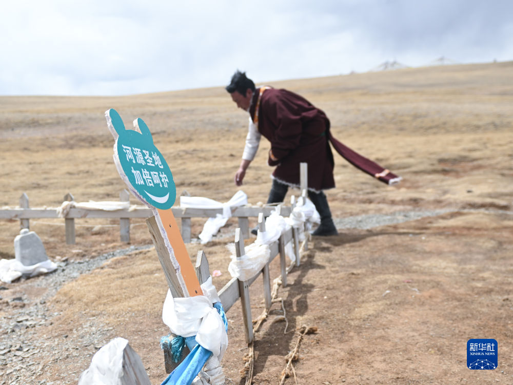 4月21日,在青海省玉樹藏族自治州曲麻萊縣麻多鄉(xiang) 約古宗列曲附近,生態管護員格桑東(dong) 周在整理黃河源頭的柵欄。新華社記者 張龍 攝
