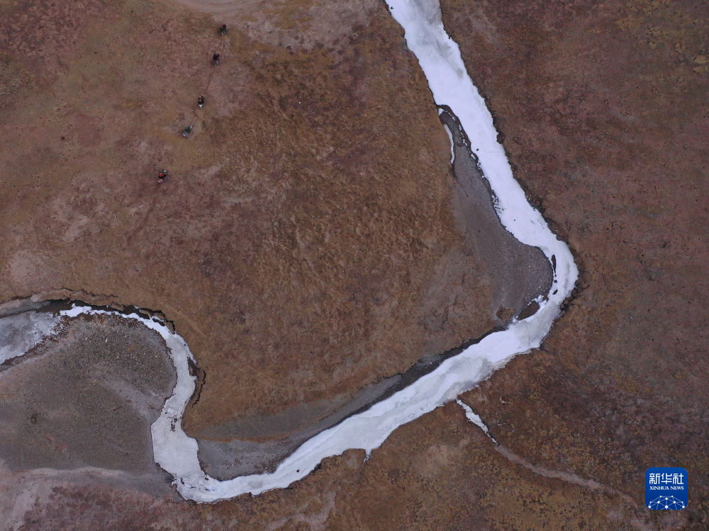 4月21日,在青海省玉樹藏族自治州曲麻萊縣麻多鄉(xiang) 約古宗列曲附近,生態管護員在巡護(無人機照片)。新華社記者 張龍 攝