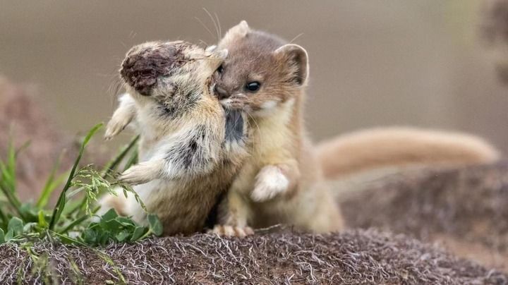 2021年7月22日在祁連山國家公園青海片區拍攝的一隻香鼬(右)叼著一隻捕獲的鼠兔。鮑永清 攝 新華社發
