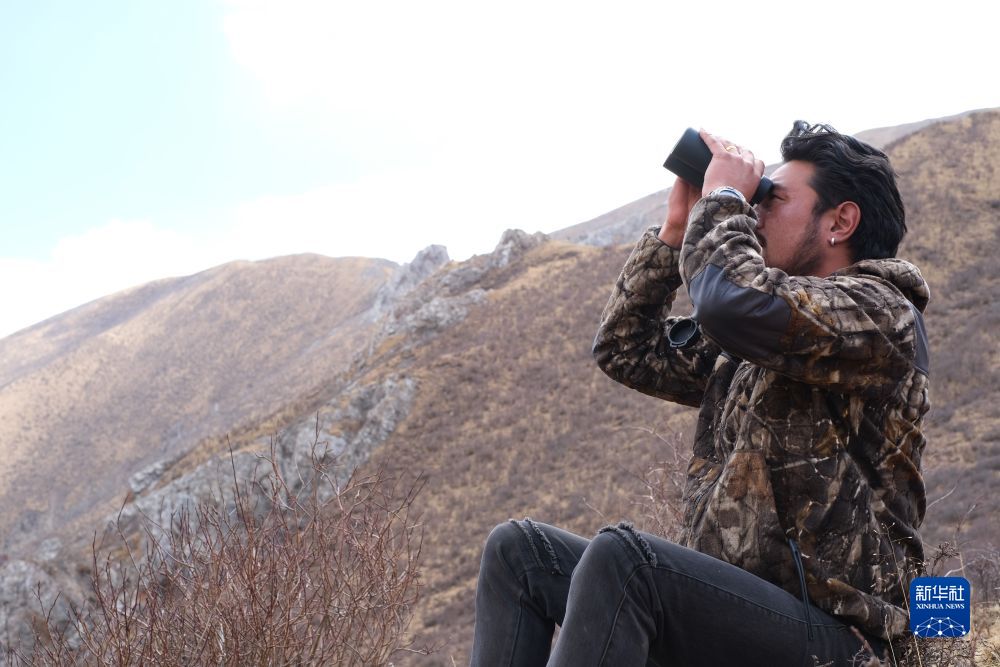 4月22日,生態管護員達傑用望遠鏡觀察對麵山上的野生動物。新華社記者 央秀達珍 攝