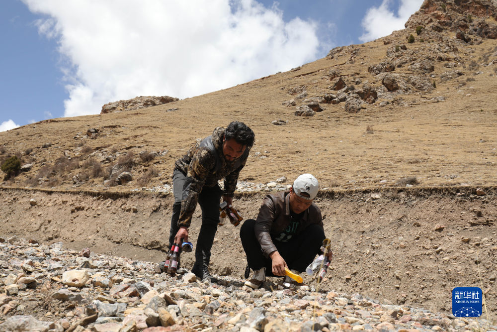 4月22日,生態管護員達傑(左)和尕次在撿垃圾。新華社記者 央秀達珍 攝