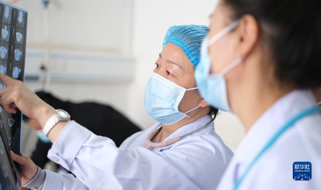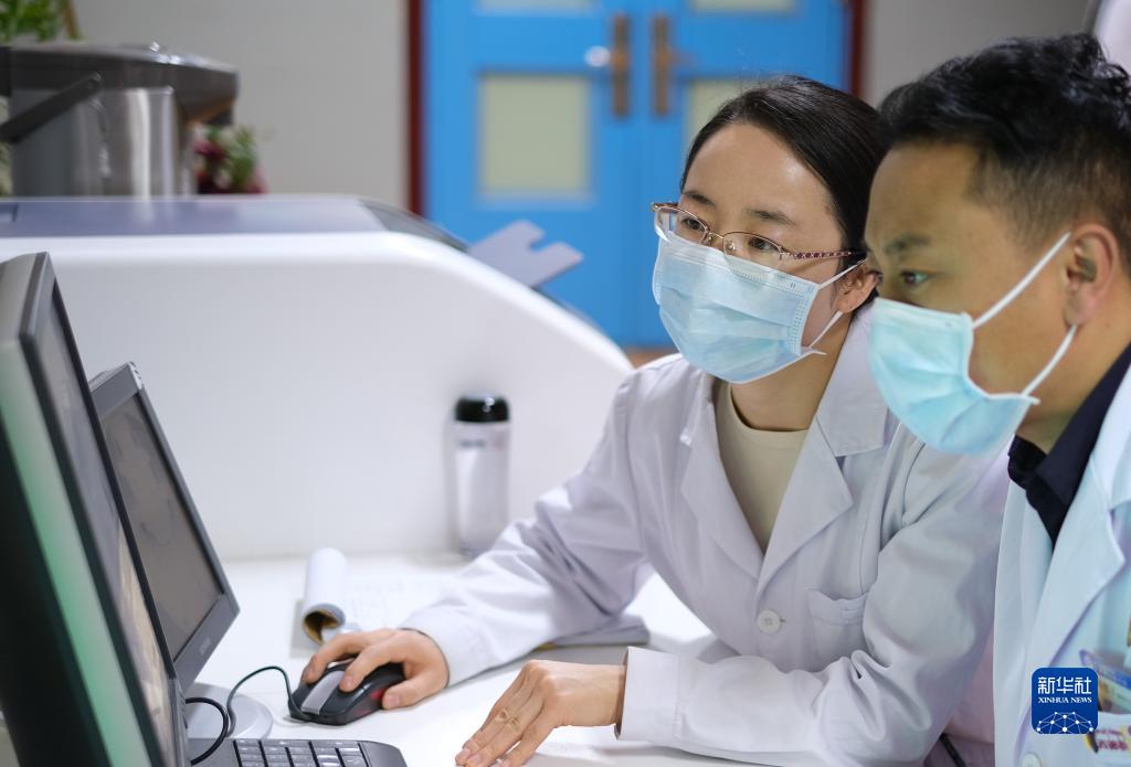 4月25日,青海省婦女兒(er) 童醫院醫生、青南支醫隊員孫敬(左)給青海省玉樹藏族自治州人民醫院醫生講解患者胸部CT。新華社記者 央秀達珍 攝