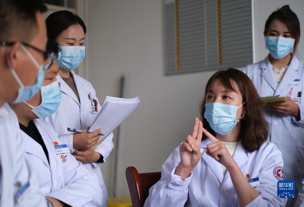4月25日,青海省人民醫院醫生、青南支醫隊員謝延玲(右二)和青海省玉樹藏族自治州人民醫院醫生探討患者病情。新華社記者 央秀達珍 攝