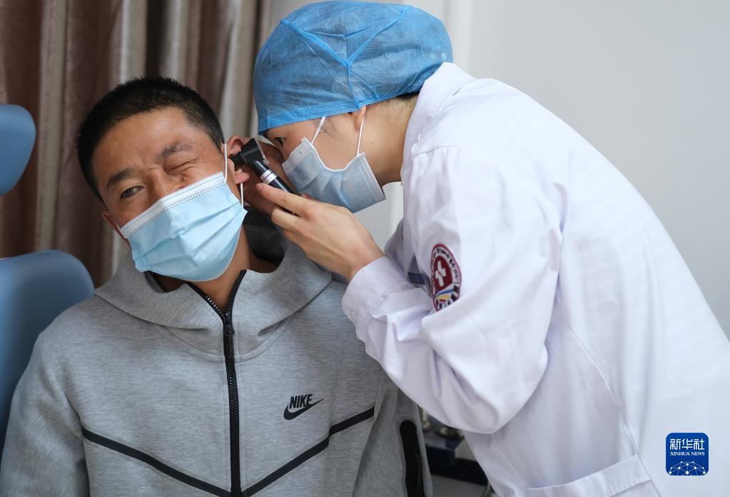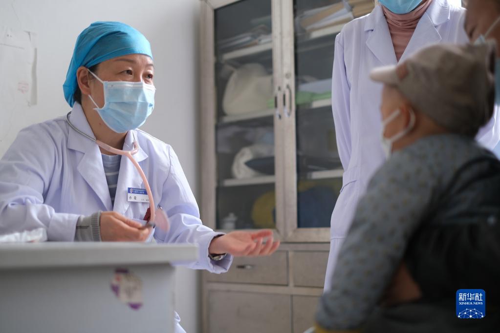 4月25日,青海省婦女兒(er) 童醫院醫生、青南支醫隊員孫敬在青海省玉樹藏族自治州人民醫院給患者檢查身體(ti) 。新華社記者 韓方方 攝