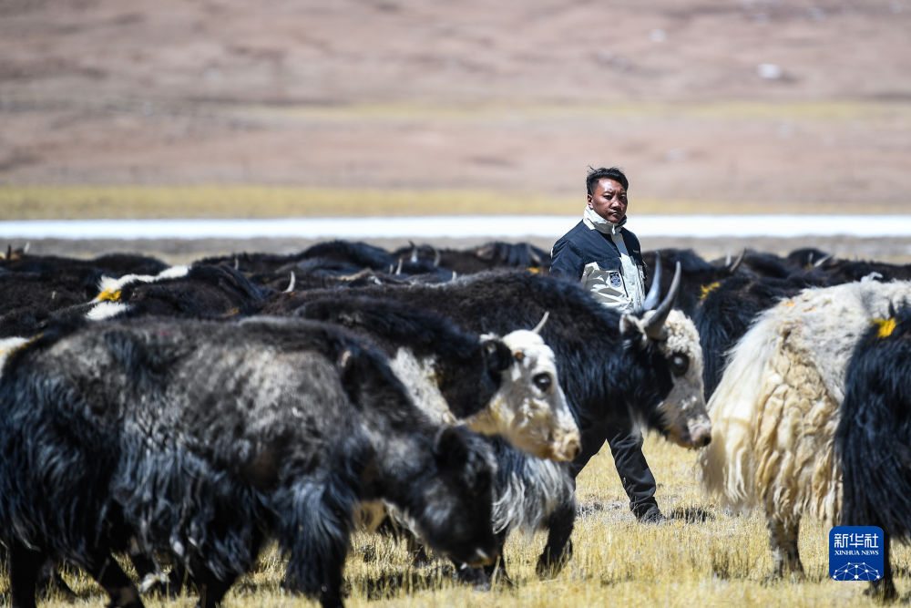 尼瑪才仁正在草場查看犛牛(4月20日攝)。新華社記者 張龍 攝