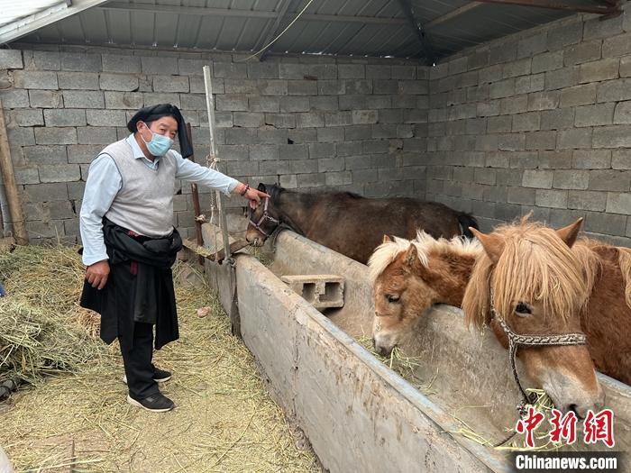 4月27日,才哇在生態畜牧業(ye) 合作社內(nei) 飼喂馬匹。 中新社記者 李江寧 攝