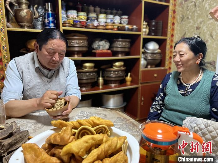 4月27日,才哇與(yu) 妻子在家中吃早餐。 中新社記者 李江寧 攝