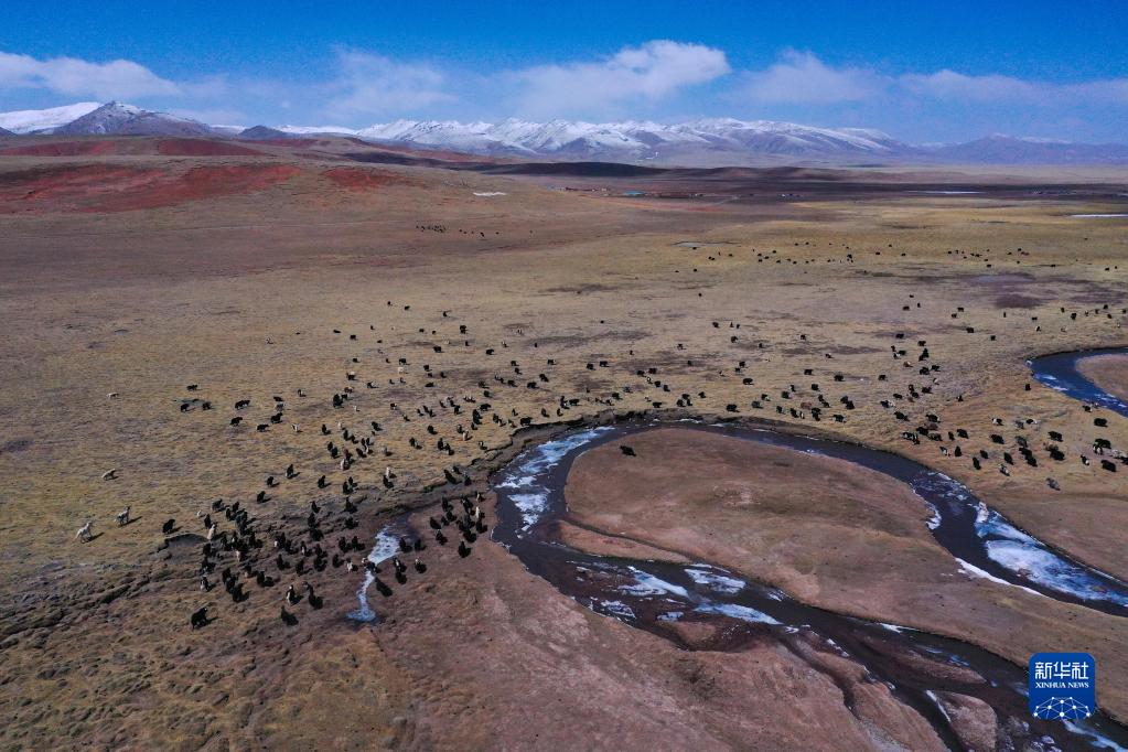 4月19日,在青海省玉樹藏族自治州治多縣,犛牛在覓食(無人機照片)。新華社記者 張龍 攝