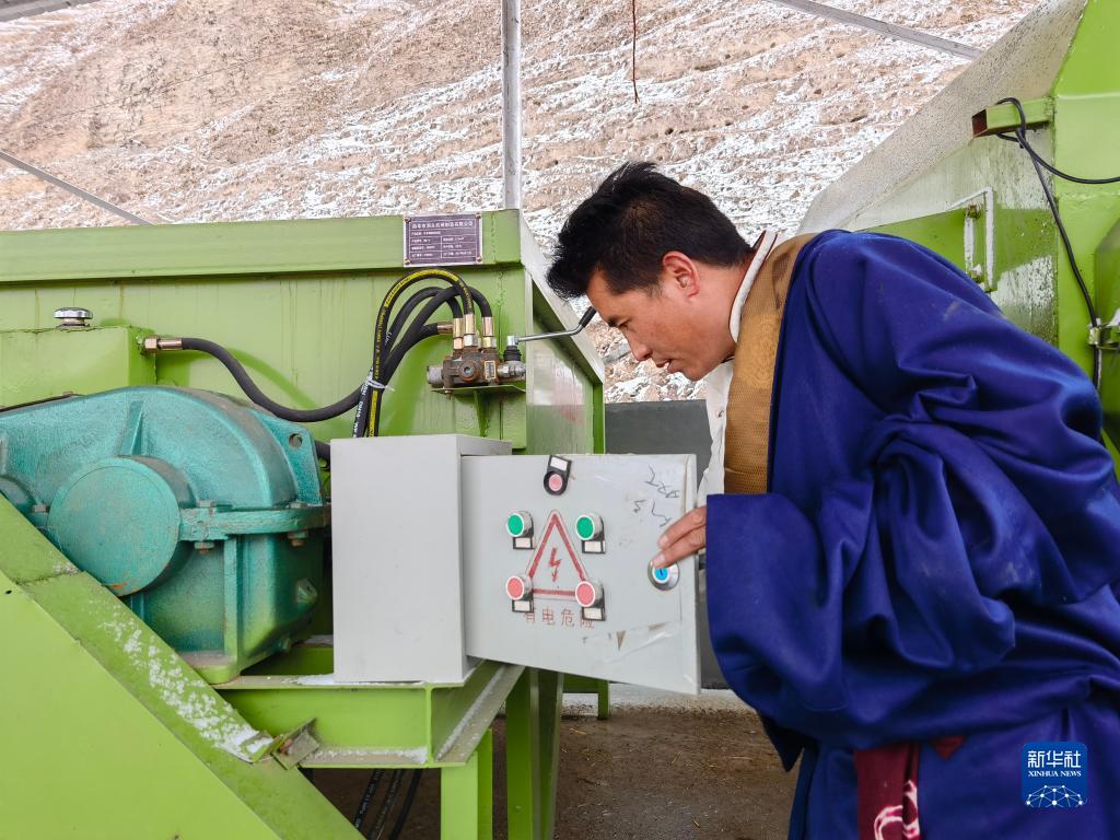 4月27日,在青海省玉樹藏族自治州稱多縣三江源高原現代生態牧業(ye) 示範點,工作人員在清理草料拌料機。新華社記者 柳澤興(xing) 攝