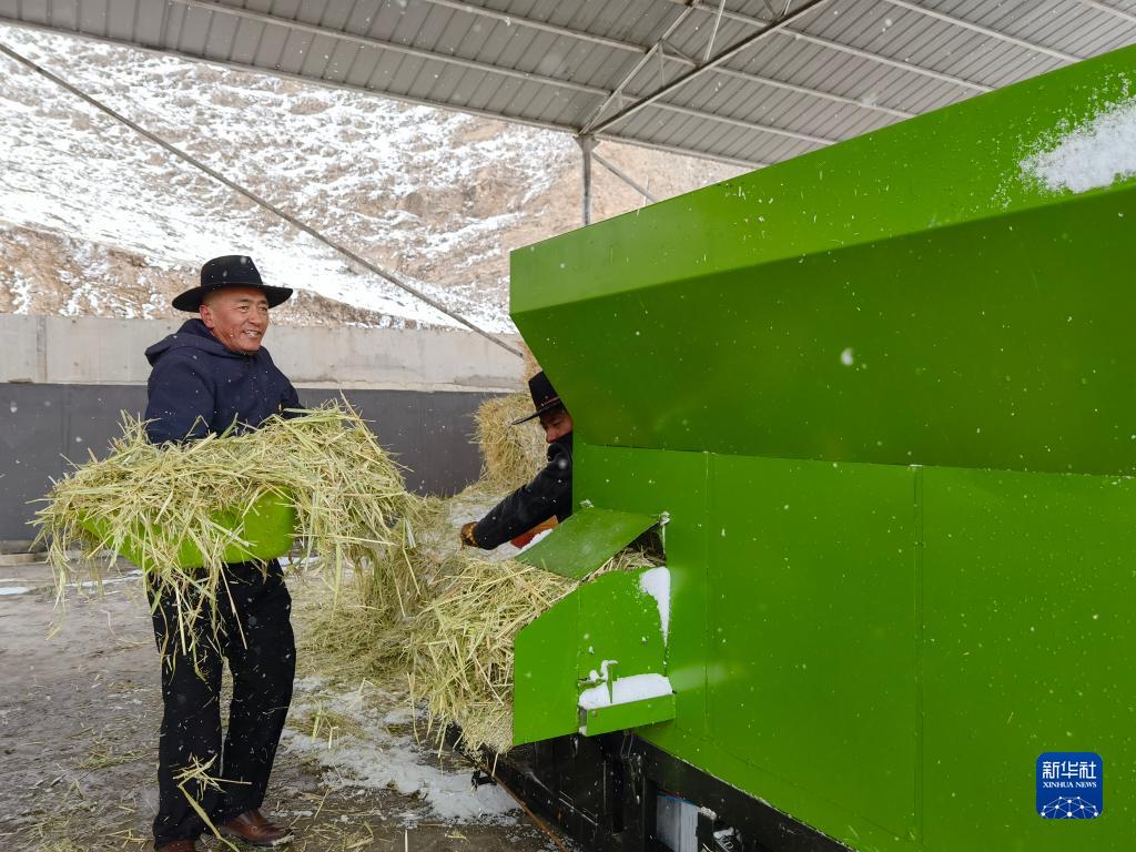 4月27日,在青海省玉樹藏族自治州稱多縣三江源高原現代生態牧業(ye) 示範點,昂巴拉農(nong) 牧民專(zhuan) 業(ye) 合作社理事長布德在處理草料。新華社記者 柳澤興(xing) 攝