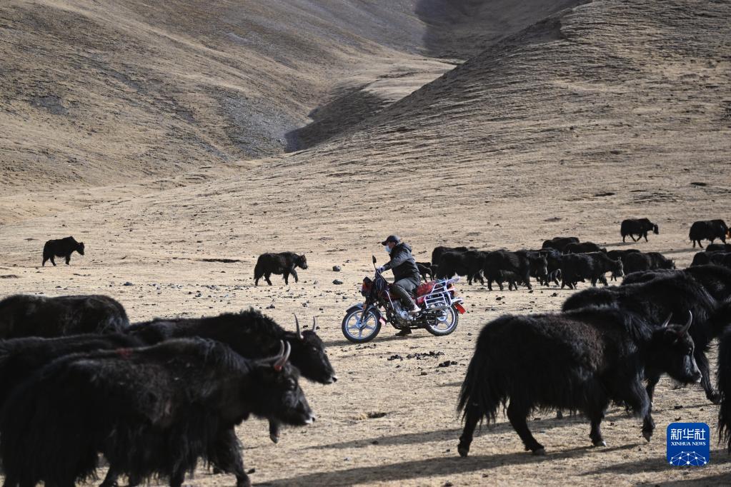 4月20日,在青海省玉樹藏族自治州曲麻萊縣葉格鄉(xiang) 紅旗村,牧民騎著摩托照料野血犛牛。新華社記者 張龍 攝