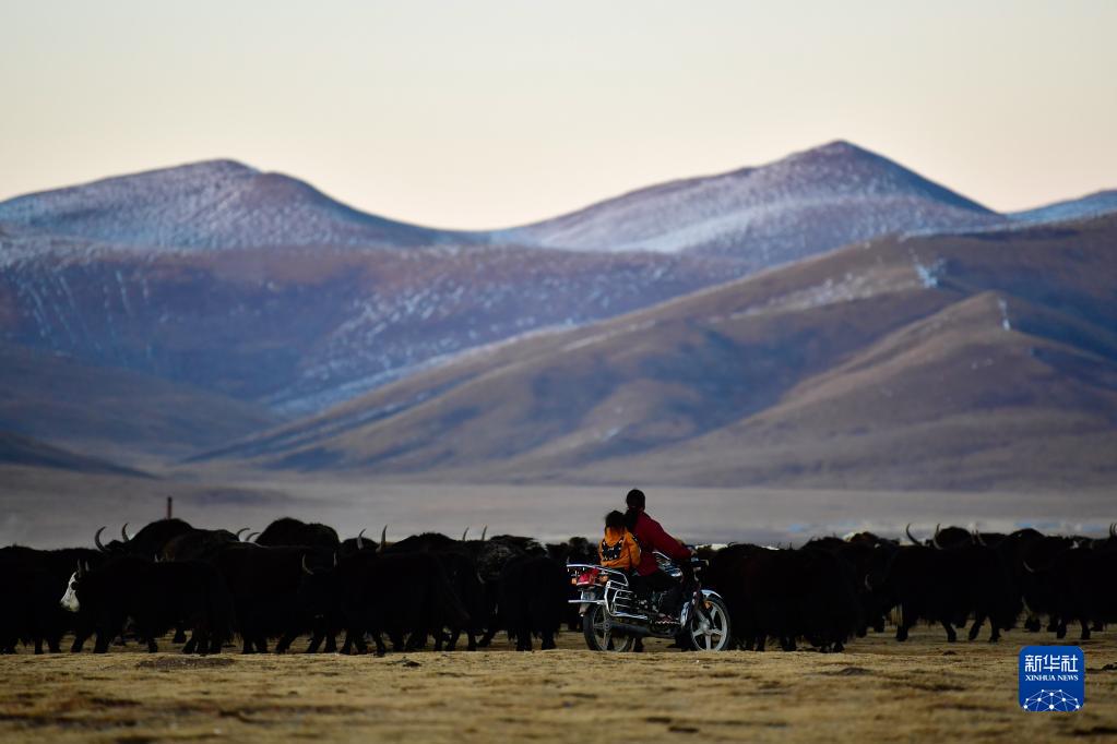 2020年10月28日,在青海省玉樹藏族自治州稱多縣珍秦鎮,牧民騎著摩托車放牧。新華社記者 張龍 攝
