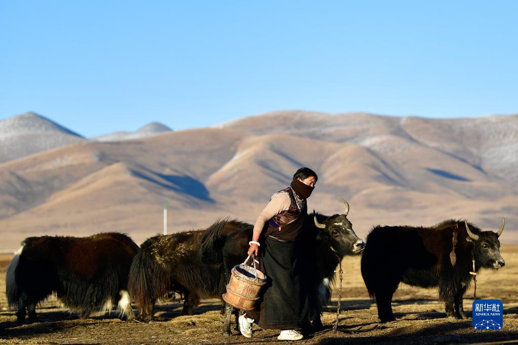2020年10月28日,在青海省玉樹藏族自治州稱多縣珍秦鎮,牧民準備給犛牛擠奶。新華社記者 張龍 攝