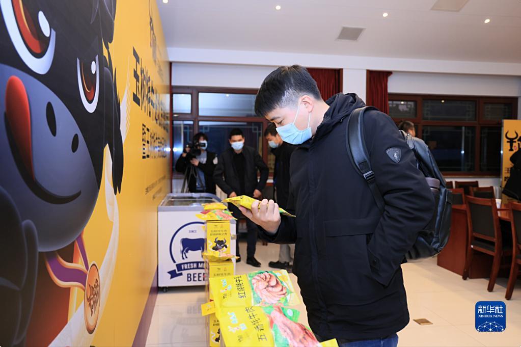 2月23日,“玉樹犛牛進北京”懇談會(hui) 暨玉樹犛牛美食品鑒會(hui) 在北京舉(ju) 行,消費者在挑選月盛齋製作的玉樹犛牛肉醬鹵產(chan) 品。新華社發