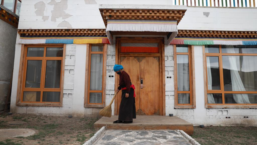 俄合拉村村民旦知草在自家的民宿前打掃衛生。新華社記者 任延昕 攝