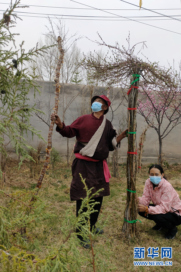 都蘭(lan) 縣察蘇鎮林業(ye) 站站長才讓太(右一)和村民查看樹木的生長情況。新華網發