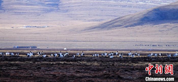 圖為(wei) 黑頸鶴在嘉塘草原漫步。稱多縣委宣傳(chuan) 部供圖