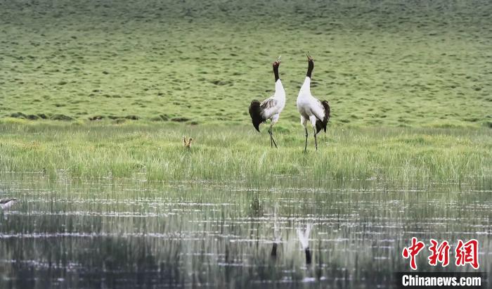圖為(wei) 黑頸鶴夫婦以高聲合鳴的方式宣誓領地,威懾入侵者。張景元 攝