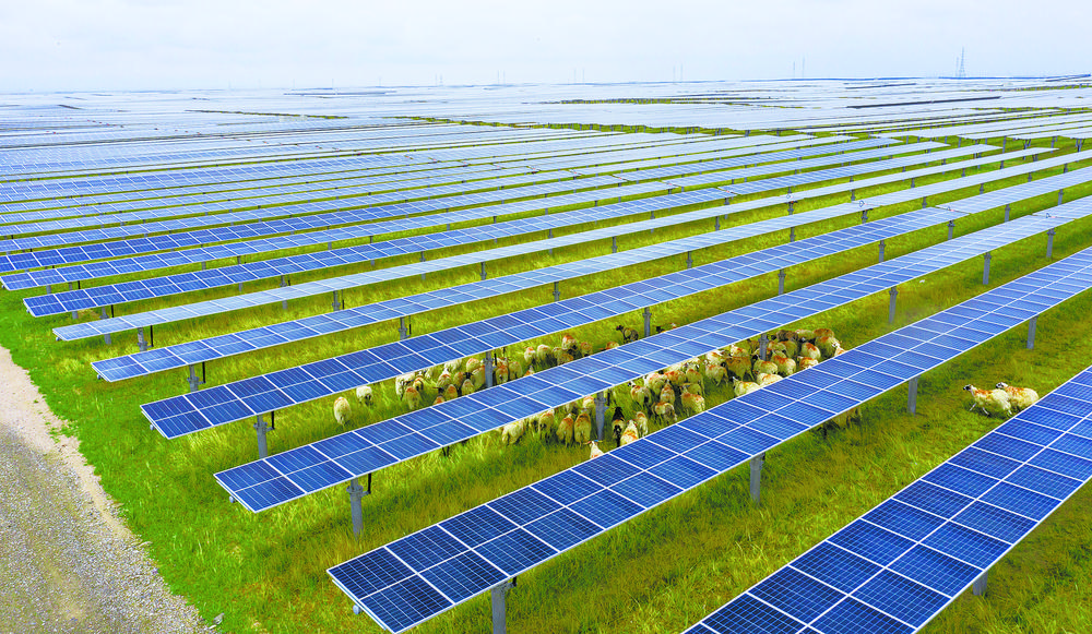 我們(men) 走進位於(yu) 共和縣塔拉灘的青海省海南藏族自治州生態光伏園區,隻見三五成群的“光伏羊”正在太陽能光伏發電板底下悠然地啃食青草,遠遠望去好似一把把珍珠撒在光伏板之間。