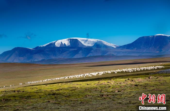 圖為(wei) 天峻縣境內(nei) 的草原和藍天、雪山相照映。天峻縣委宣傳(chuan) 部 供圖